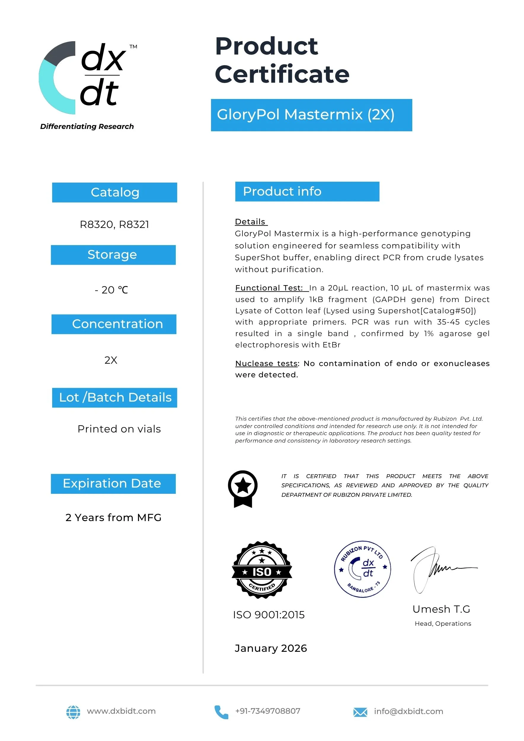 - GloryPol™ Mastermix (2X): 1ml X 5 Vials
